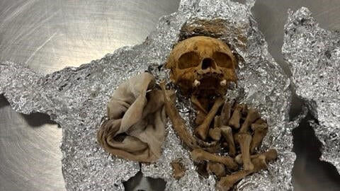 Photos shared by CBP showed what looked like a skull and vertebrae partially wrapped in aluminum foil. Other images showed officers wearing gloves and inspecting luggage on a table, with the seized items laid out in evidence bags.