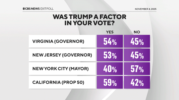 He was a factor for many voters in each of the places where exit polls were conducted: Virginia, New Jersey, New York City and California. And more said their vote in these races was to oppose him, than support him.
