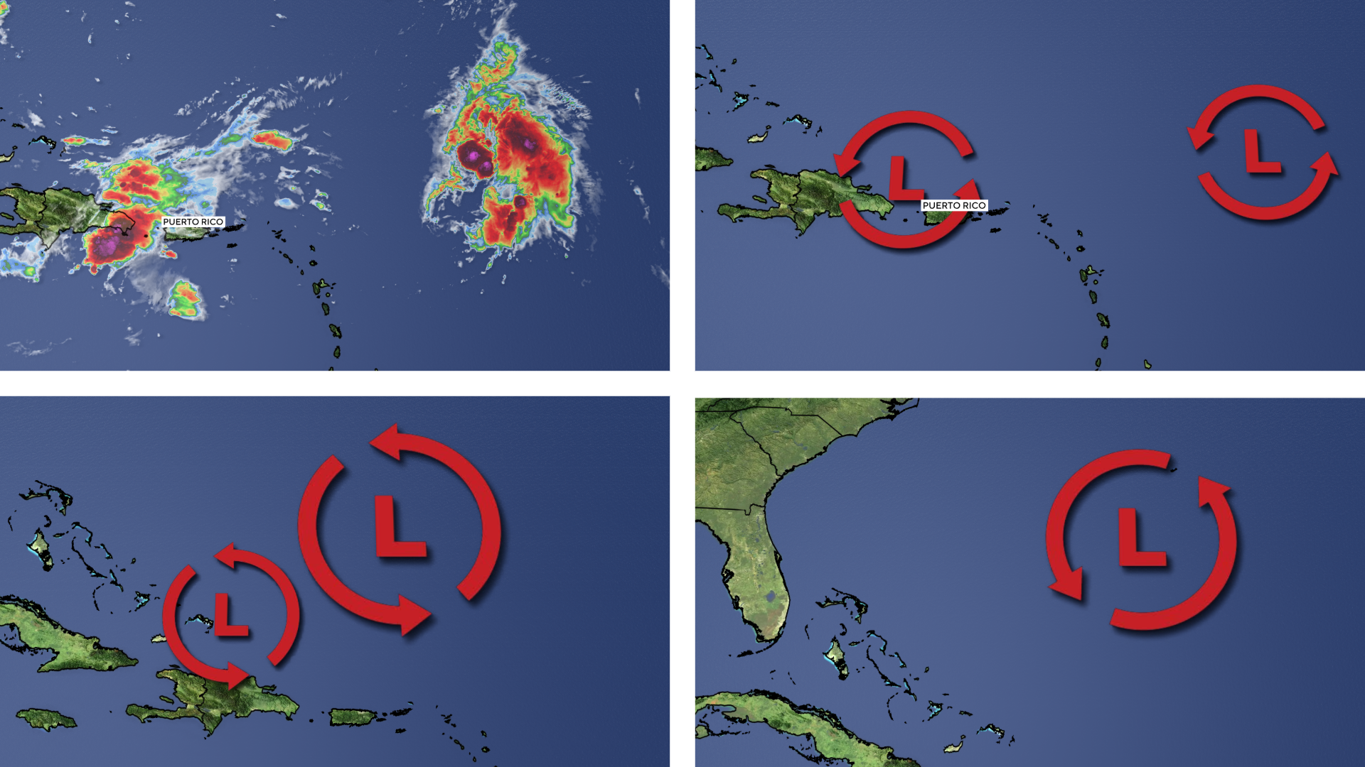 How the process plays out depends on the characteristics of the storms involved, according to the National Weather Service. The forecasting agency describes the Fujiwhara effect on its website as “an intense dance” between two tropical storms that can happen when they get close enough to each other on their respective tracks to reach a common point and either join together or spin around each other for a period of time before continuing along their individual paths.