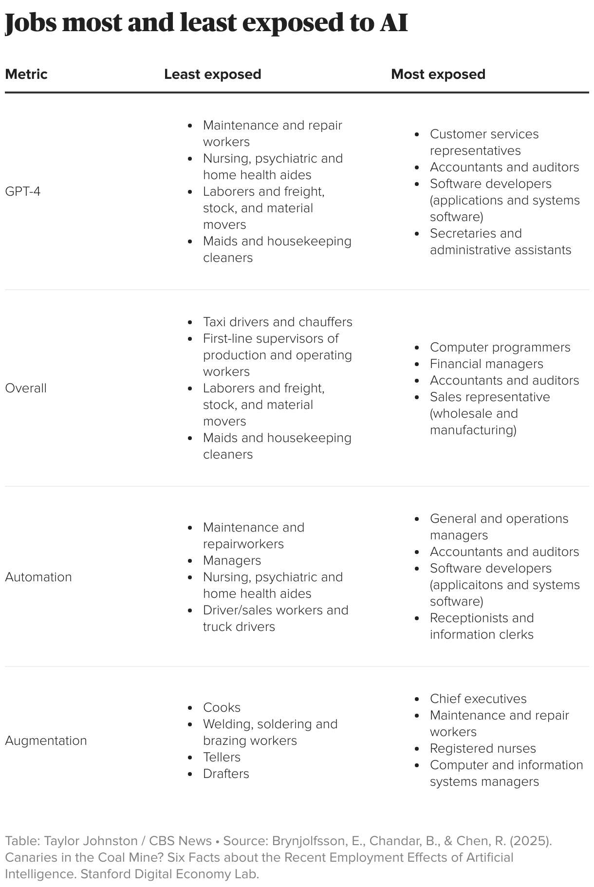 “These large language models are trained on books, articles and written material found on the internet and elsewhere,” Brynjolfsson told CBS MoneyWatch. “That’s the kind of book learning that a lot of people get at universities before they enter the job market, so there is a lot of overlap with between these LLMs and the knowledge young people have.”